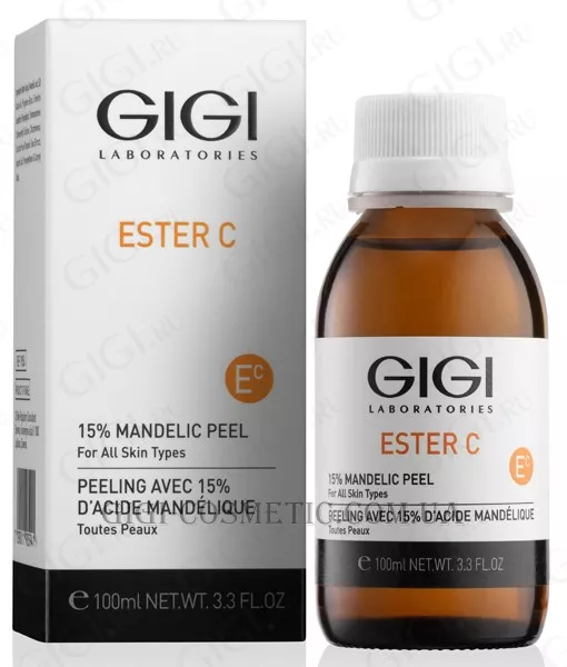 Мигдальний пілінг GiGi ESTER C Mandelic Peel 15% застосовується для омолодження шкіри кистей рук, зони декольте, вирівнювання кольору та текстури шкіри. Засіб застосовується в салонних процедурах, у тому числі в комплексі з глибокими чистками.